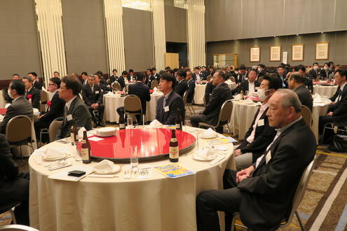 午後6時00分から行った懇親会では、竹内理事長が開会挨拶、広島県祝業能力開発協会専務理事 新山信夫様のsご祝辞に続き、トーソー㈱中四国ブロック長 岡部元彦様の乾杯ご発声で開宴した。和やかな歓談の中で今総会にて理事に就任した平野崇氏の挨拶、賛助会員のご紹介と挨拶、また青年部会から部会長、メンバーの挨拶を行い、濱本副理事長の中締めで午後8時00分に全ての行事を終了した。