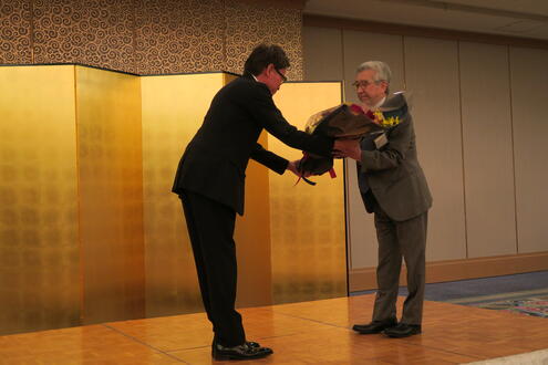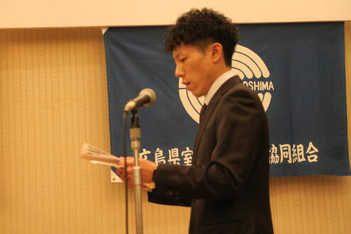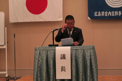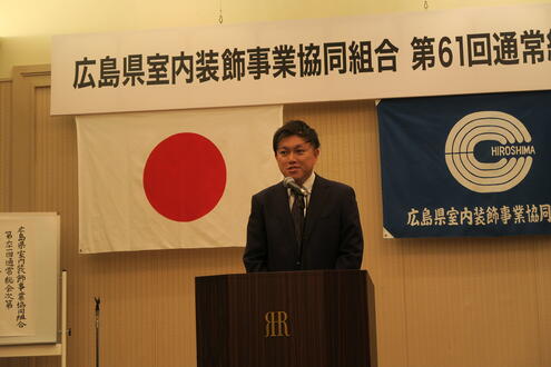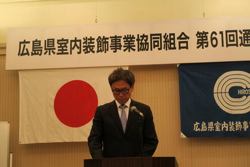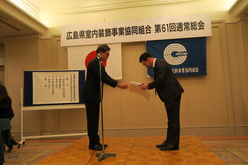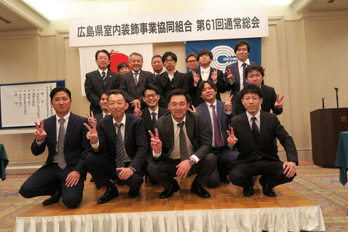 第61回通常総会・永年勤続従業員表彰式・懇親会を開催 広島県室内装事業協同組合は、5月30日(金)広島市・リーガロイヤルホテル広島で、午後4時00分より第61回通常総会を開催し、令和6年度の事業報告及び決算報告の承認、令和7年度の事業計画並びに予算の決定等は原案どおり可決した。 この日総会は、岡田理事長の開会の挨拶に続き、広島県中小企業団体中央会 総務企画部主事の赤羽政哉様から祝辞をいただいた後、議長に中島副理事長を選出して議事に入り、5つの議案を審議し全てが承認された。 続いて行われた永年勤続従業員表彰式では20年勤続表彰者1名、10年勤続表彰者13名、5年勤続表彰者7名の計21名の内、実出席の11名の方に岡田理事長より表彰状と記念品が授与された。被表彰者を代表し有限会社ティーエムプランニング松村大地様が謝辞を述べた。 午後6時00分から行った懇親会では、岡田理事長の挨拶に続いて来賓を代表して広島県職業能力開発協会 技能振興コーナー長 武田明彦様から祝辞をいただいた。㈱サンゲツ中国四国支社 大同隆之支社長の乾杯のご発声に続いて和やかに懇親会が開始された。 9年間に渡り事務局長を務められた藤本浩之様より退任の挨拶をいただき、長年のご尽力に感謝し花束を贈呈した。その後、賛助会員・卸組合員(メーカー)のご紹介と挨拶の後、竹内理事の中締めで午後8時00分に全ての行事を終了した。